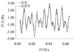 由於在該山東国产麻豆精品成人毛片中,蝸舌與葉片都是国产麻豆精品成人毛片內部不可忽視的噪聲源,因此以蝸舌部位和葉片為聲源區域采用FW-H方程進行噪聲的計算分析,在出氣口中心建立觀測點,所得聲壓隨時間的變化如圖所示。相對於原型国产麻豆精品成人毛片,改進型国产麻豆精品成人毛片的聲壓幅值降低了2.38 Pa。圖10給出了蝸舌和葉片激發的噪聲頻譜,相對於原型国产麻豆精品成人毛片,改進型国产麻豆精品成人毛片在渦脫頻率和基頻上的峰值均有所降低。